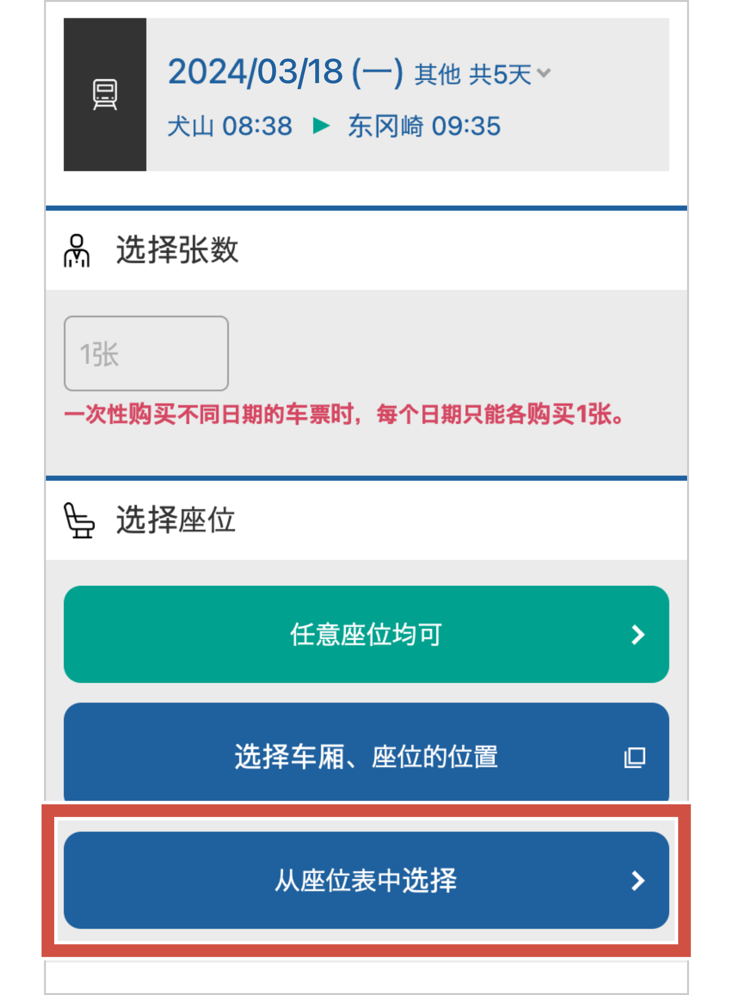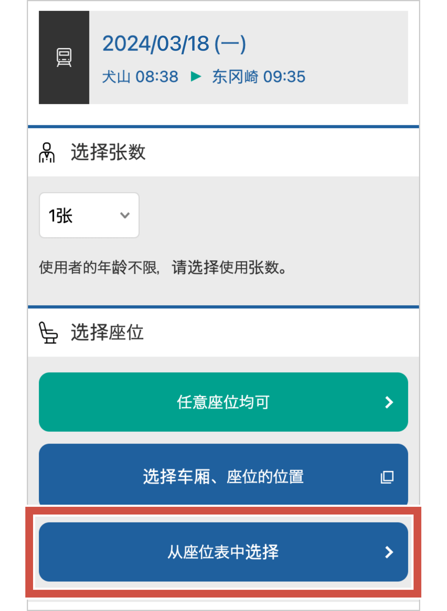 - 如需购买轮椅专用座位/优先座位,请选择“从座位表中选择”。