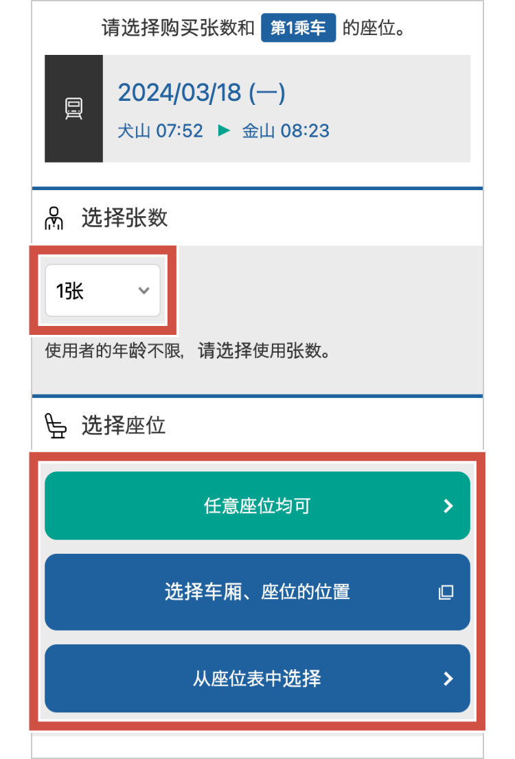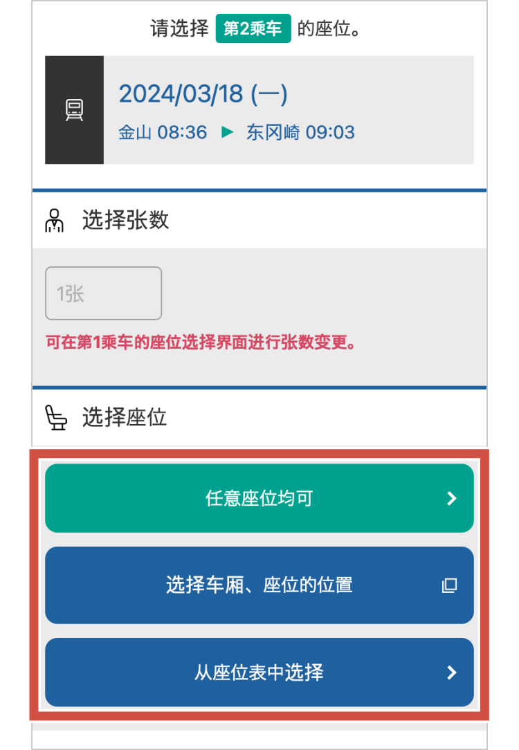 - 购买换乘μ车票时,请分别选择第1乘车、第2乘车的座位。