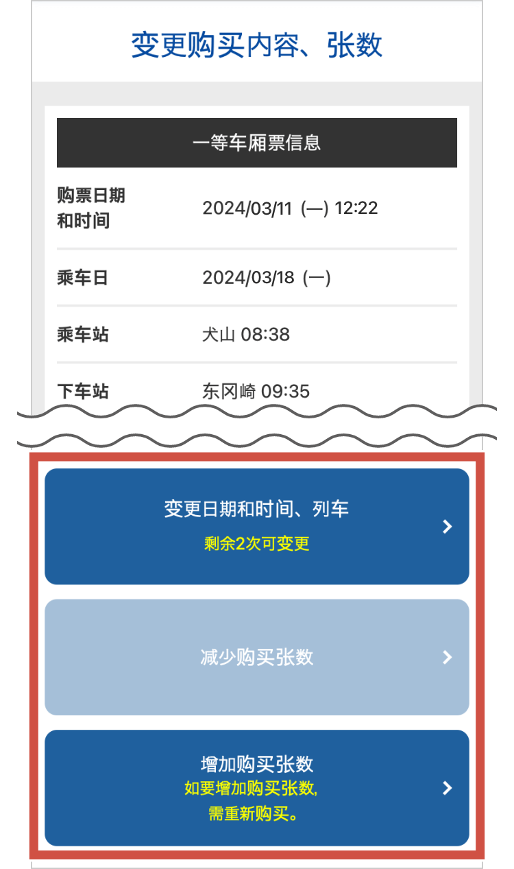 若要变更乘车日期、时间、列车、购买张数,请按下“变更”按钮。