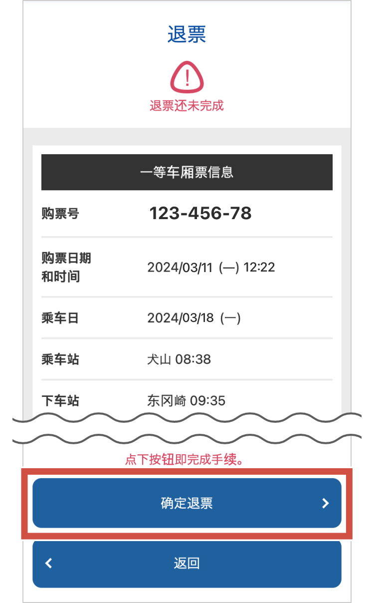 - 如果是因顾客自身原因退票,请确认希望退票的特别车车票信息,在确认无误后按下“确定退票”按钮。