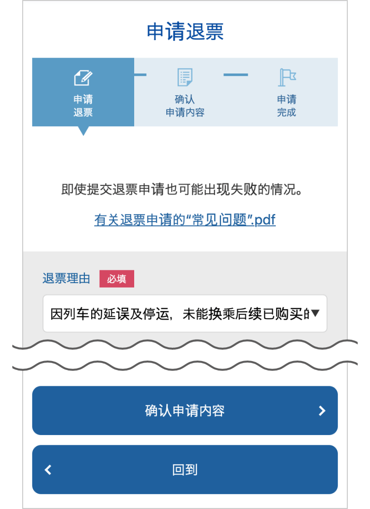 因列车延误而来不及乘坐后续预定的列车等,由于不得已的原因无法乘车时,请进行退票申请。